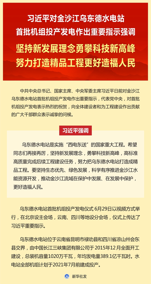 新華社北京6月29日電 中共中央總書記、國家主席、中央軍委主席習(xí)近平日前對金沙江烏東德水電站首批機(jī)組投產(chǎn)發(fā)電作出重要指示,代表黨中央,對首批機(jī)組投產(chǎn)發(fā)電表示熱烈的祝賀,向全體建設(shè)者和為工程建設(shè)作出貢獻(xiàn)的廣大干部群眾表示誠摯的問候。 習(xí)近平強(qiáng)調(diào),烏東德水電站是實施“西電東送”的國家重大工程。希望同志們再接再厲,堅持新發(fā)展理念,勇攀科技新高峰,高標(biāo)準(zhǔn)高質(zhì)量完成后續(xù)工程建設(shè)任務(wù),努力把烏東德水電站打造成精品工程。要堅持生態(tài)優(yōu)先、綠色發(fā)展,科學(xué)有序推進(jìn)金沙江水能資源開發(fā),推動金沙江流域在保護(hù)中發(fā)展、在發(fā)展中保護(hù),更好造福人民。 烏東德水電站首批機(jī)組投產(chǎn)發(fā)電儀式29日以視頻方式舉行,在北京設(shè)主會場,云南、四川等地設(shè)分會場,儀式上傳達(dá)了習(xí)近平重要指示。 烏東德水電站位于云南省昆明市祿勸縣和四川省涼山州會東縣交界,由中國長江三峽集團(tuán)有限公司于2015年12月全面開工建設(shè),總裝機(jī)容量1020萬千瓦,年均發(fā)電量389.1億千瓦時。水電站全部機(jī)組計劃于2021年7月前建成投產(chǎn)。