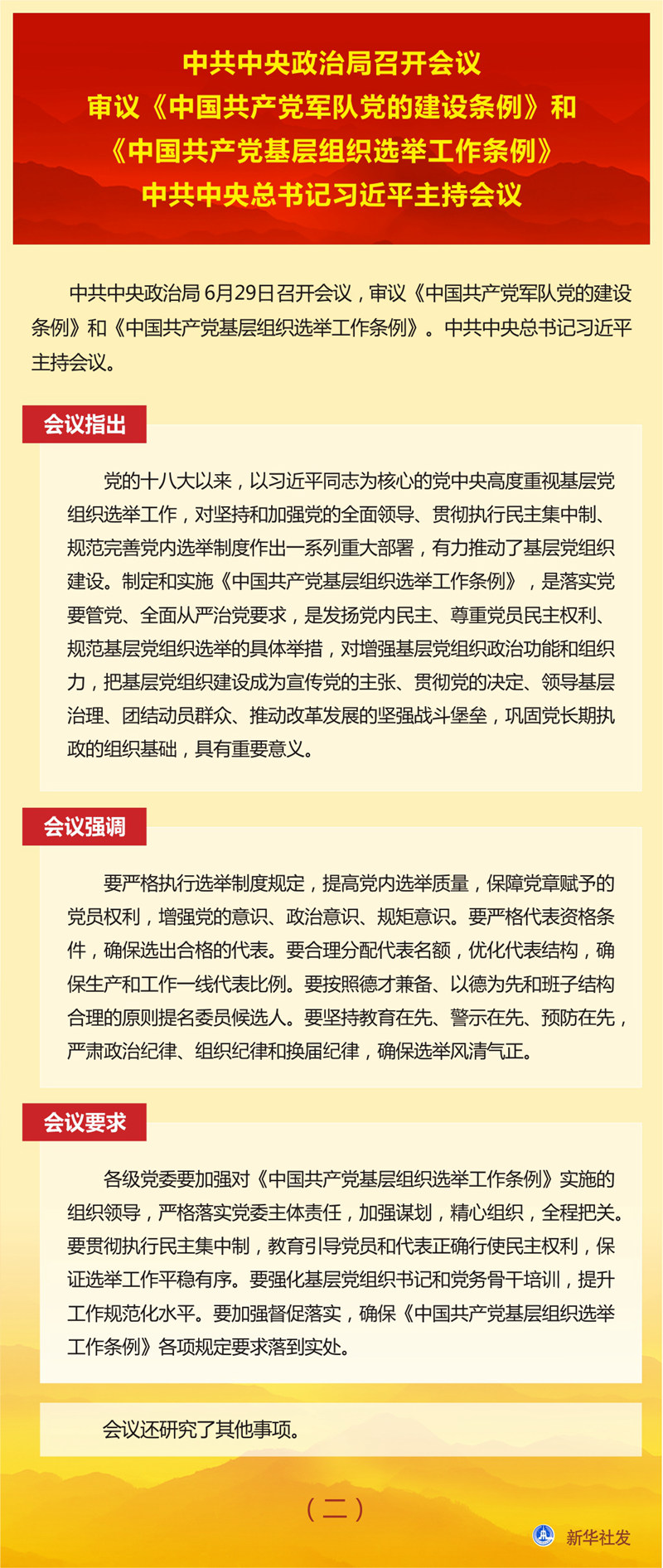 中共中央政治局召開會(huì)議 審議《中國共產(chǎn)黨軍隊(duì)黨的建設(shè)條例》和《中國共產(chǎn)黨基層組織選舉工作條例》 中共中央總書記習(xí)近平主持會(huì)議 新華社北京6月29日電 中共中央政治局6月29日召開會(huì)議,審議《中國共產(chǎn)黨軍隊(duì)黨的建設(shè)條例》和《中國共產(chǎn)黨基層組織選舉工作條例》。中共中央總書記習(xí)近平主持會(huì)議。 會(huì)議指出,黨的領(lǐng)導(dǎo)和黨的建設(shè)是人民軍隊(duì)建設(shè)發(fā)展的關(guān)鍵,關(guān)系強(qiáng)軍事業(yè)興衰成敗,關(guān)系黨和國家長治久安。制定《中國共產(chǎn)黨軍隊(duì)黨的建設(shè)條例》,是深入貫徹習(xí)近平新時(shí)代中國特色社會(huì)主義思想和黨的十九大精神的重要舉措,對(duì)增強(qiáng)“四個(gè)意識(shí)”、堅(jiān)定“四個(gè)自信”、做到“兩個(gè)維護(hù)”,貫徹軍委主席負(fù)責(zé)制,對(duì)確保黨對(duì)軍隊(duì)絕對(duì)領(lǐng)導(dǎo),確保有效履行新時(shí)代軍隊(duì)使命任務(wù),確保人民軍隊(duì)永葆性質(zhì)、宗旨、本色,對(duì)實(shí)現(xiàn)黨在新時(shí)代的強(qiáng)軍目標(biāo)、把人民軍隊(duì)全面建成世界一流軍隊(duì),具有重要意義。 會(huì)議強(qiáng)調(diào),要毫不動(dòng)搖堅(jiān)持黨對(duì)軍隊(duì)絕對(duì)領(lǐng)導(dǎo),全面深入貫徹軍委主席負(fù)責(zé)制,持續(xù)深化政治整訓(xùn),做到絕對(duì)忠誠、絕對(duì)純潔、絕對(duì)可靠。要堅(jiān)持聚焦聚力備戰(zhàn)打仗,把戰(zhàn)斗力這個(gè)唯一的根本的標(biāo)準(zhǔn)貫徹到人民軍隊(duì)黨的建設(shè)全過程和各方面,推動(dòng)黨的政治優(yōu)勢(shì)和組織優(yōu)勢(shì)轉(zhuǎn)化為制勝優(yōu)勢(shì)。要堅(jiān)持貫徹全面從嚴(yán)治黨要求,堅(jiān)定不移正風(fēng)肅紀(jì),堅(jiān)決糾治形式主義、官僚主義。要堅(jiān)持勇于自我革命,不斷自我凈化、自我完善、自我革新、自我提高。 會(huì)議要求,要加強(qiáng)《中國共產(chǎn)黨軍隊(duì)黨的建設(shè)條例》學(xué)習(xí)宣傳和貫徹落實(shí)。要突出書記隊(duì)伍和班子成員,抓好學(xué)習(xí)培訓(xùn),提高抓黨的建設(shè)的意識(shí)和能力。要強(qiáng)化領(lǐng)導(dǎo)督導(dǎo),確?!吨袊伯a(chǎn)黨軍隊(duì)黨的建設(shè)條例》有效執(zhí)行、落地見效。 會(huì)議指出,黨的十八大以來,以習(xí)近平同志為核心的黨中央高度重視基層黨組織選舉工作,對(duì)堅(jiān)持和加強(qiáng)黨的全面領(lǐng)導(dǎo)、貫徹執(zhí)行民主集中制、規(guī)范完善黨內(nèi)選舉制度作出一系列重大部署,有力推動(dòng)了基層黨組織建設(shè)。制定和實(shí)施《中國共產(chǎn)黨基層組織選舉工作條例》,是落實(shí)黨要管黨、全面從嚴(yán)治黨要求,是發(fā)揚(yáng)黨內(nèi)民主、尊重黨員民主權(quán)利、規(guī)范基層黨組織選舉的具體舉措,對(duì)增強(qiáng)基層黨組織政治功能和組織力,把基層黨組織建設(shè)成為宣傳黨的主張、貫徹黨的決定、領(lǐng)導(dǎo)基層治理、團(tuán)結(jié)動(dòng)員群眾、推動(dòng)改革發(fā)展的堅(jiān)強(qiáng)戰(zhàn)斗堡壘,鞏固黨長期執(zhí)政的組織基礎(chǔ),具有重要意義。 會(huì)議強(qiáng)調(diào),要嚴(yán)格執(zhí)行選舉制度規(guī)定,提高黨內(nèi)選舉質(zhì)量,保障黨章賦予的黨員權(quán)利,增強(qiáng)黨的意識(shí)、政治意識(shí)、規(guī)矩意識(shí)。要嚴(yán)格代表資格條件,確保選出合格的代表。要合理分配代表名額,優(yōu)化代表結(jié)構(gòu),確保生產(chǎn)和工作一線代表比例。要按照德才兼?zhèn)?、以德為先和班子結(jié)構(gòu)合理的原則提名委員候選人。要堅(jiān)持教育在先、警示在先、預(yù)防在先,嚴(yán)肅政治紀(jì)律、組織紀(jì)律和換屆紀(jì)律,確保選舉風(fēng)清氣正。 會(huì)議要求,各級(jí)黨委要加強(qiáng)對(duì)《中國共產(chǎn)黨基層組織選舉工作條例》實(shí)施的組織領(lǐng)導(dǎo),嚴(yán)格落實(shí)黨委主體責(zé)任,加強(qiáng)謀劃,精心組織,全程把關(guān)。要貫徹執(zhí)行民主集中制,教育引導(dǎo)黨員和代表正確行使民主權(quán)利,保證選舉工作平穩(wěn)有序。要強(qiáng)化基層黨組織書記和黨務(wù)骨干培訓(xùn),提升工作規(guī)范化水平。要加強(qiáng)督促落實(shí),確保《中國共產(chǎn)黨基層組織選舉工作條例》各項(xiàng)規(guī)定要求落到實(shí)處。 會(huì)議還研究了其他事項(xiàng)。 |