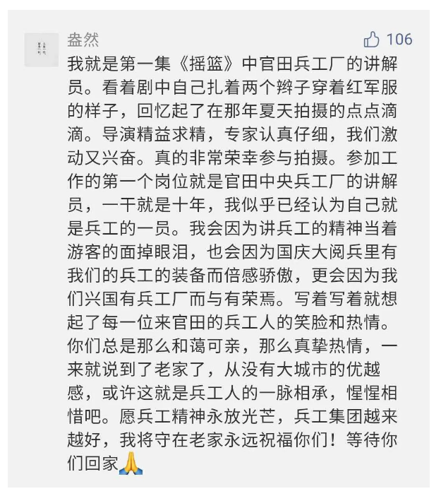 在中國(guó)共產(chǎn)黨成立九十九周年之際,由中國(guó)兵器工業(yè)集團(tuán)有限公司組織攝制、反映人民兵工在黨的領(lǐng)導(dǎo)下80余年光輝奮斗歷程、廣大兵工人弘揚(yáng)“把一切獻(xiàn)給黨”人民兵工精神的三集紀(jì)錄片《人民兵工》自7月1日-3日每晚20點(diǎn)在中央廣播電視總臺(tái)中文國(guó)際頻道(CCTV-4)《國(guó)家記憶》首播以來(lái),在兵器系統(tǒng)和觀眾中引發(fā)強(qiáng)烈反響,很多網(wǎng)友、觀眾紛紛留言表達(dá)了自己的觀后感受。 觀眾在兵器工業(yè)集團(tuán)官微的留言區(qū)直抒了觀影感受,有的熱淚盈眶,有的心潮起伏,有的興起賦詩(shī),有的認(rèn)為讓心靈得到凈化、思想得以提升,有的認(rèn)為是最直觀的國(guó)防教育教材......