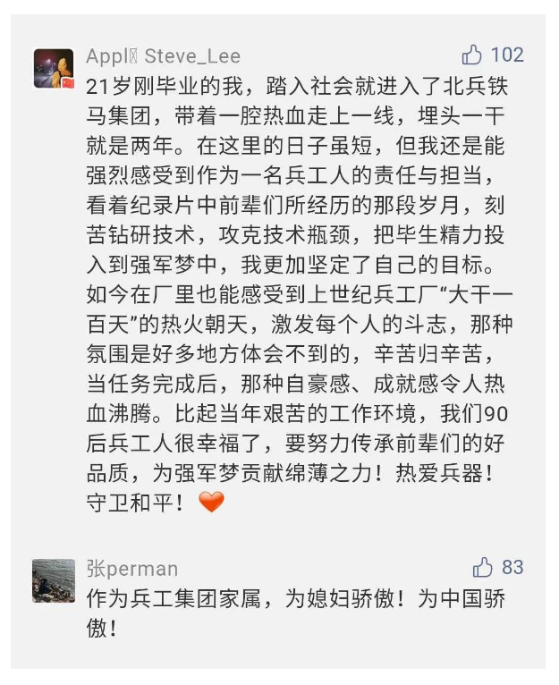作為新時(shí)代弘揚(yáng)人民兵工精神的特色文化成果,紀(jì)錄片的播出,凝聚起廣大兵器干部職工團(tuán)結(jié)奮斗新時(shí)代磅礴力量,極大的增強(qiáng)了兵工人的自豪感,大家紛紛表達(dá)了作為軍工央企一員 “此生無(wú)悔入軍工”的使命擔(dān)當(dāng)......