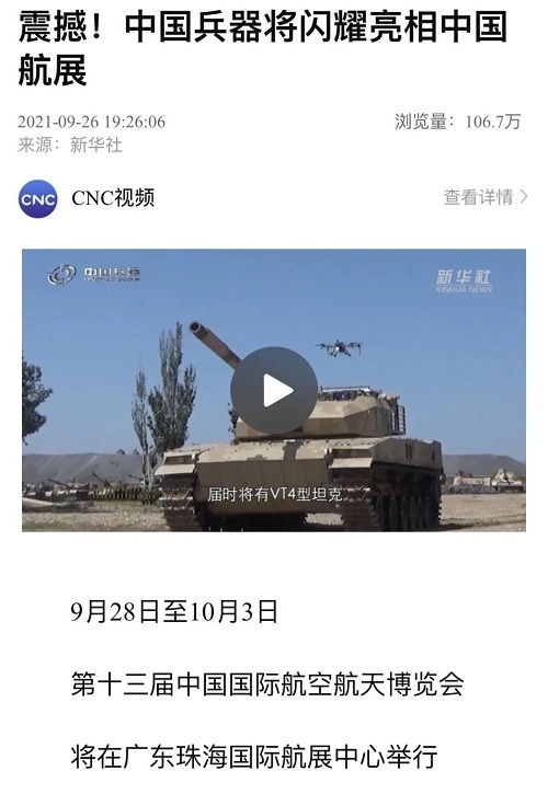 9月28日-10月3日,第十三屆中國(guó)國(guó)際航空航天博覽會(huì)在廣東珠海舉行,中國(guó)兵器工業(yè)集團(tuán)有限公司作為主辦單位閃耀亮相,推出裝甲突擊、火力打擊、智能彈藥、防空反導(dǎo)、無(wú)人裝備、非傳統(tǒng)安全、軍工軍技合作等領(lǐng)域新產(chǎn)品及成體系成建制武器系統(tǒng)和解決方案,全方位展示我國(guó)陸軍外貿(mào)武器裝備的最高水平以及雄厚的科技創(chuàng)新、自主研發(fā)與先進(jìn)制造能力,受到廣泛關(guān)注。 央視《新聞聯(lián)播》報(bào)道第十三屆中國(guó)航展,著重介紹了VT4主戰(zhàn)坦克,關(guān)注航展公眾日中國(guó)兵器館情況。9月28日下午央視《新聞直播間》航展特別節(jié)目《藍(lán)天盛會(huì)》邀請(qǐng)集團(tuán)公司訪談嘉賓做客直播間對(duì)中國(guó)兵器館兵器工業(yè)集團(tuán)展區(qū)等進(jìn)行1小時(shí)直播;9月28日下午、10月2日下午分別對(duì)地面裝備動(dòng)態(tài)表演進(jìn)行兩場(chǎng)直播。央視《朝聞天下》、《新聞直播間》、《共同關(guān)注》、《天下財(cái)經(jīng)》、《軍事報(bào)道》、《正午國(guó)防軍事》、《軍武零距離》等相繼推出集團(tuán)公司參展裝備的報(bào)道。