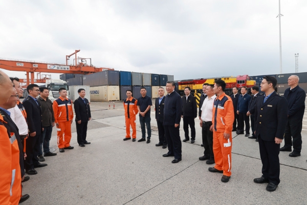 隨后,習(xí)近平來到重慶鐵路集裝箱中心站,聽取貨物集散、運輸路徑、運營成本和效益等介紹,同貨車司機(jī)、列車司機(jī)、裝卸工人、場站管理人員等親切交流,詢問他們的工作強(qiáng)度、勞動保護(hù)、節(jié)假日休息和收入情況。習(xí)近平說,大家在物流一線,也是在對外開放一線,通過你們的辛勤勞動,很多商品跨越山海、走向世界,你們的工作很有意義。推動西部大開放、促進(jìn)西部大開發(fā),物流很重要,大家要繼續(xù)努力,不斷創(chuàng)造新的業(yè)績,作出新的貢獻(xiàn)。
