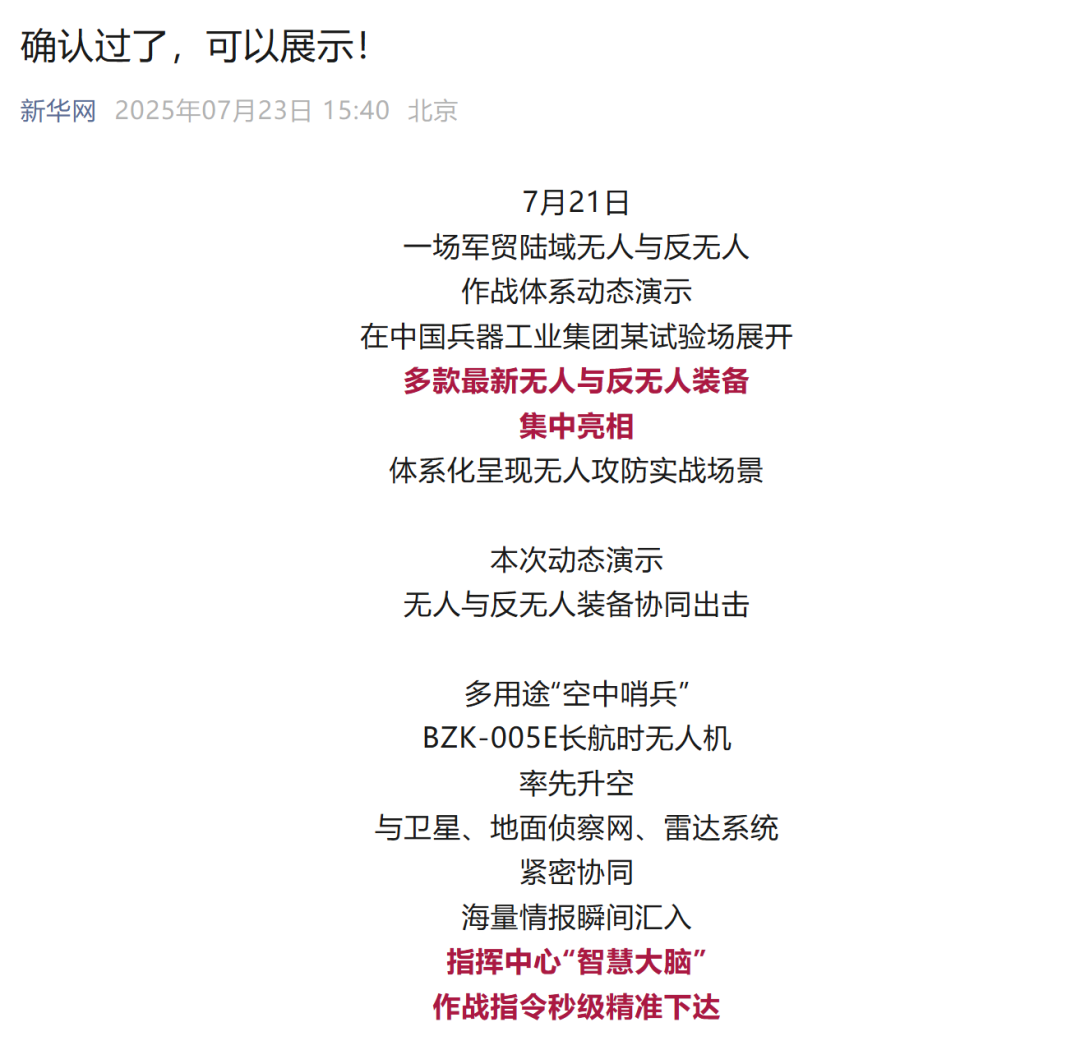 央視新聞客戶端:兵器工業(yè)集團(tuán)陸域無人與反無人作戰(zhàn)體系震撼來襲!搶先看!2025-07-24
