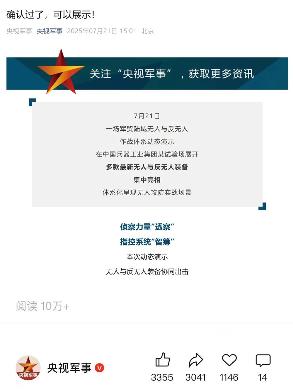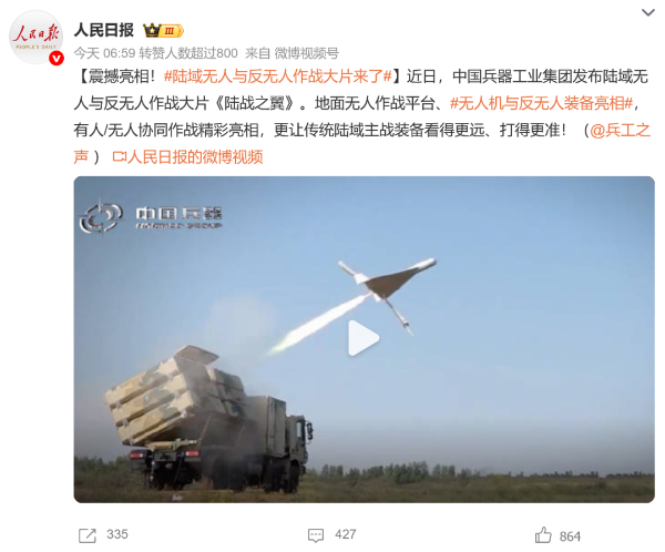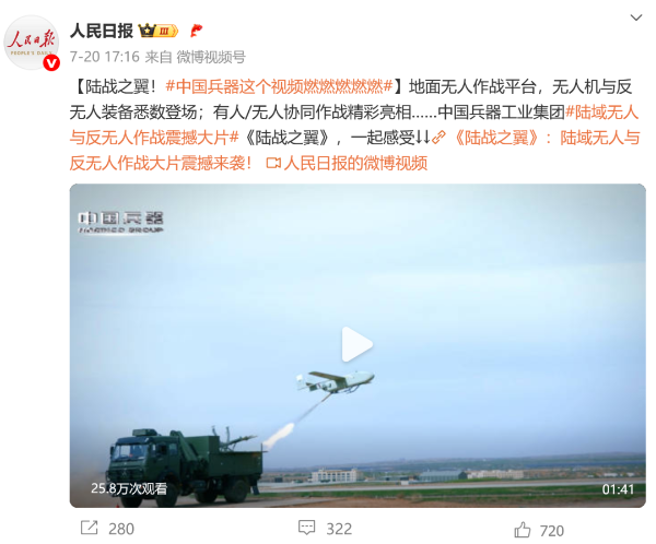 人民日?qǐng)?bào)微博、央視軍事微博、央視新聞客戶端、中國(guó)新聞網(wǎng)、中新社國(guó)是直通車抖音、環(huán)球網(wǎng)微博、環(huán)球時(shí)報(bào)(X平臺(tái)、英文版客戶端)、中國(guó)日?qǐng)?bào)網(wǎng)、央視軍事報(bào)道微博、中國(guó)軍號(hào)微博、中央廣播電視總臺(tái)“空天逐夢(mèng)”微信視頻號(hào)、共青團(tuán)中央B站、國(guó)資小新微博等中央主流媒體、國(guó)家部委的新媒體播發(fā)集團(tuán)公司陸域無人與反無人作戰(zhàn)大片等視頻作品。